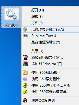 1. 点击右键 dns.bat 文件, 选择 “ 以管理员身份运行 ”