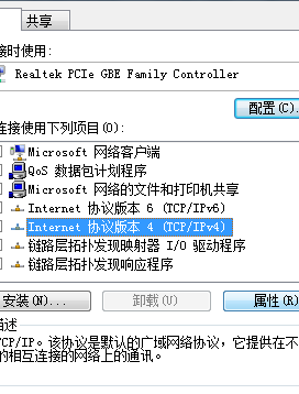 4. 在弹出的连接属性中选择 “ Internet协议版本4(TCP/IPv4) ”, 然后点击 “ 属性 ”